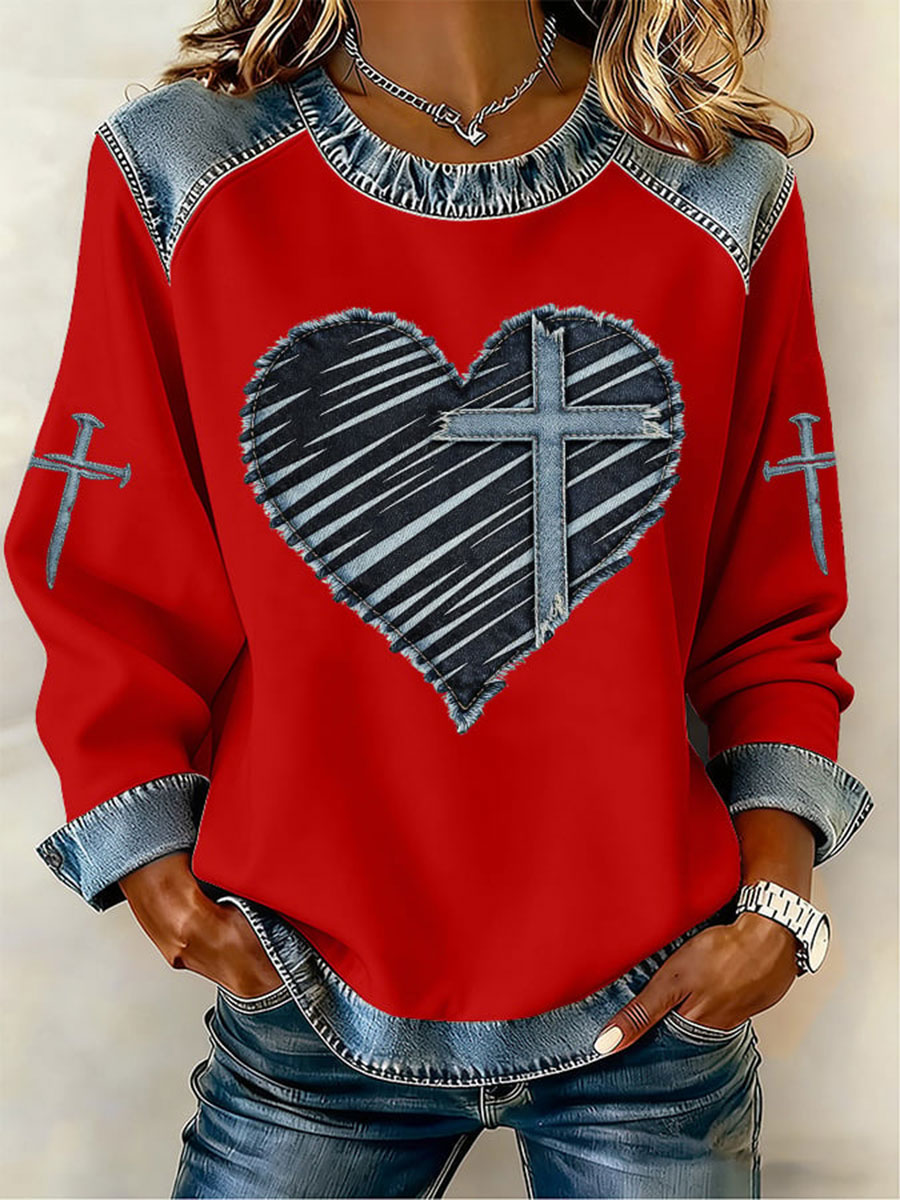 Women's Valentine's Day Retro Flower Cross Love Print Denim Patchwork Top