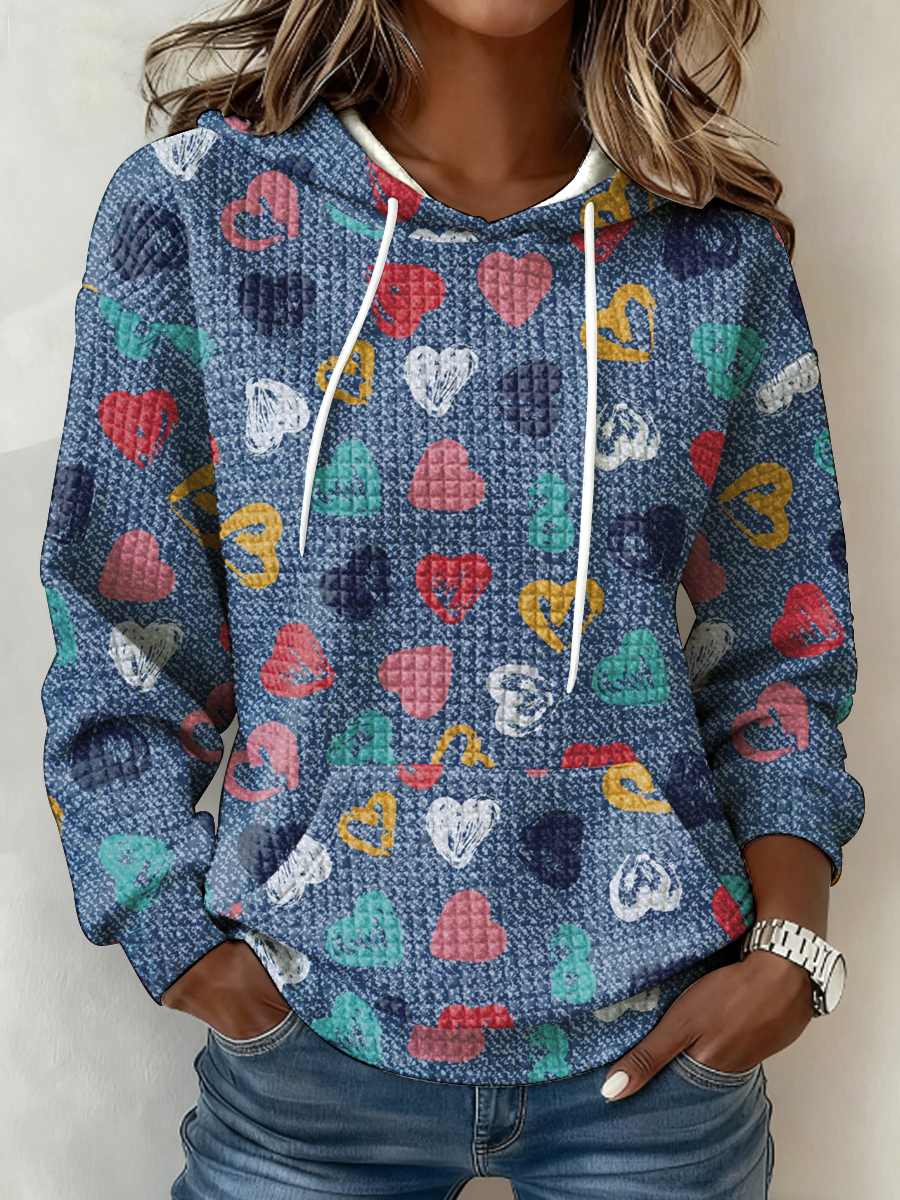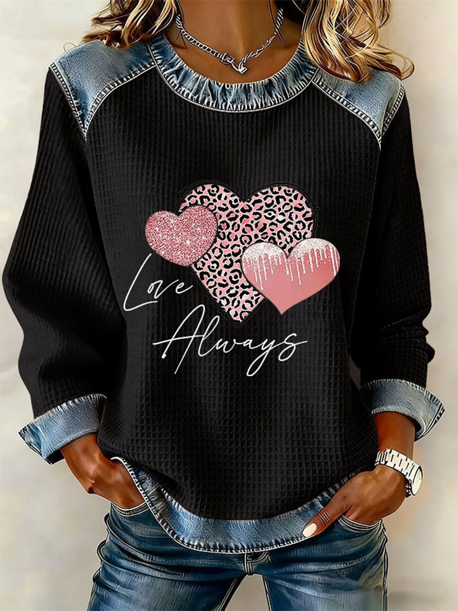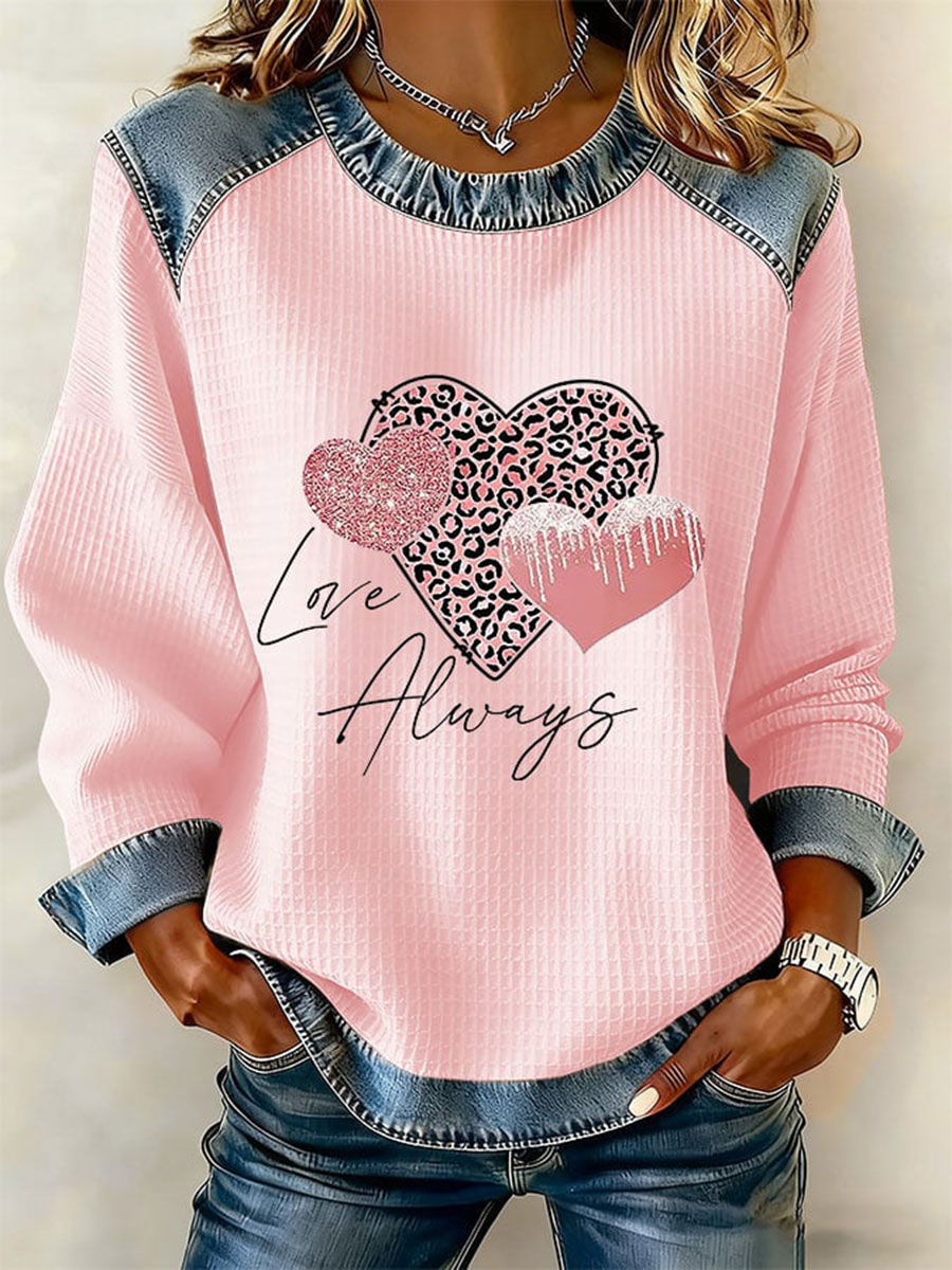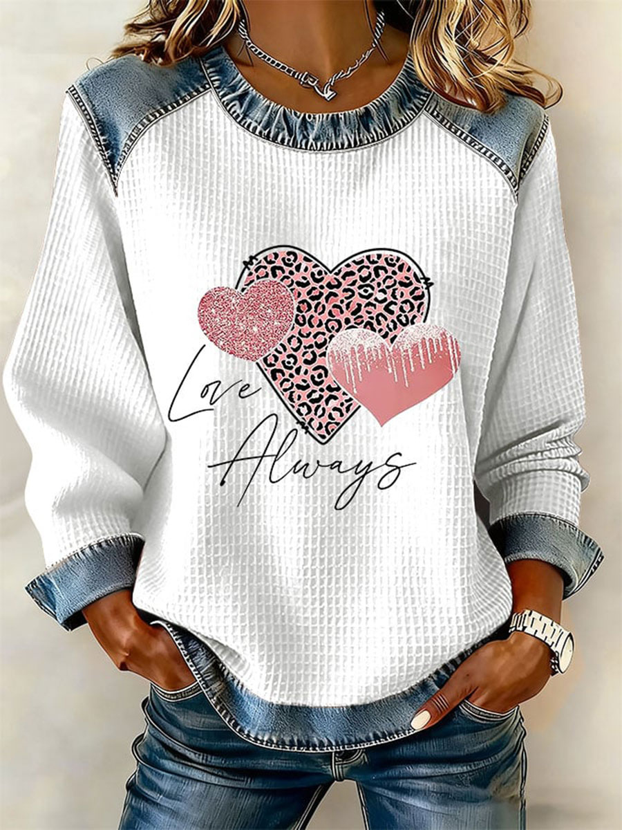 Women's Valentine's Day Vintage Flower Love Print Denim Patchwork Top