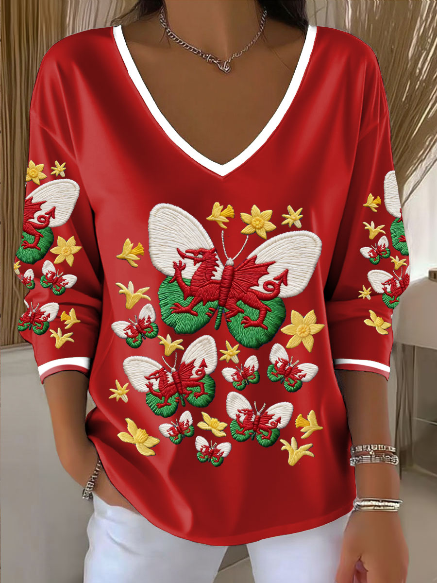 Women's Wales Welsh Rugby Art Printed V-Neck T-Shirt