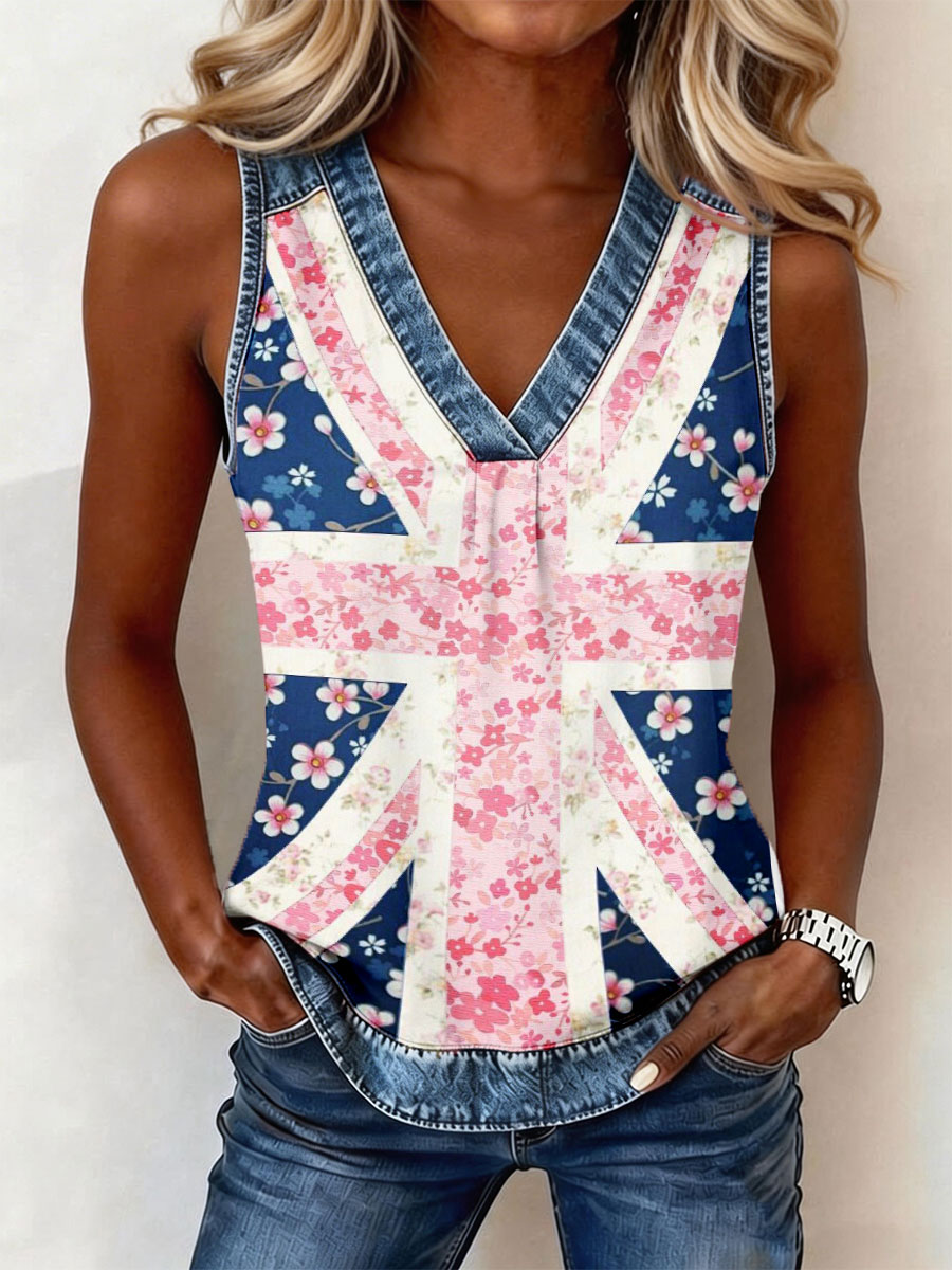 Women's British Flag Floral Print V-Neck Tops